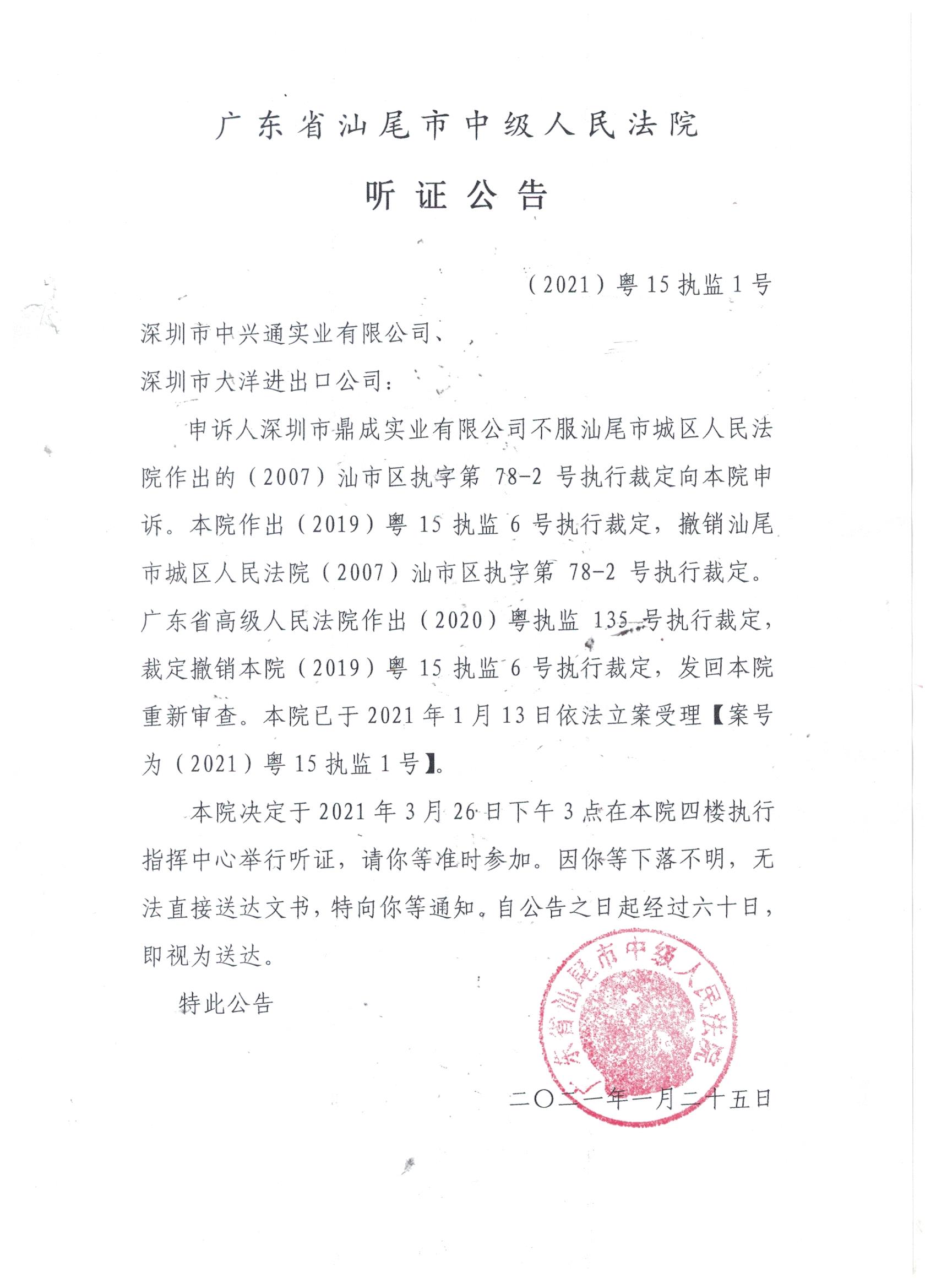 广东省365英国上市公司_sport365_365bet官网注册开户中级人民法院(2021)粤15执监1号听证公告