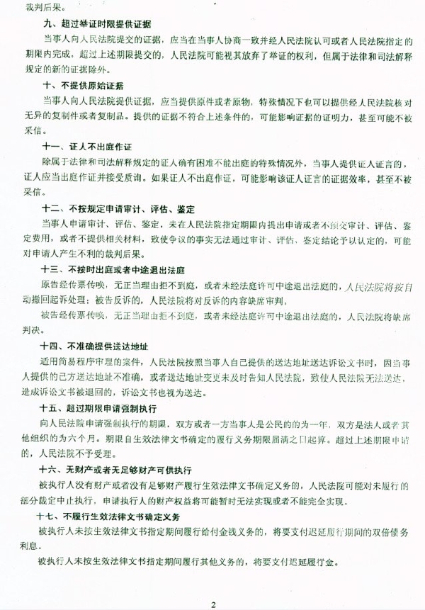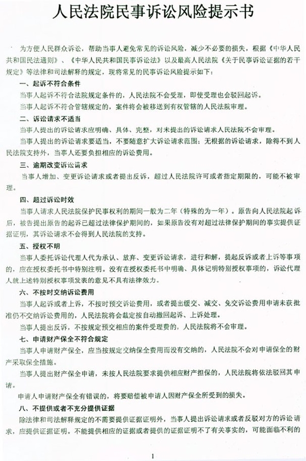 人民法院民事诉讼风险提示书
