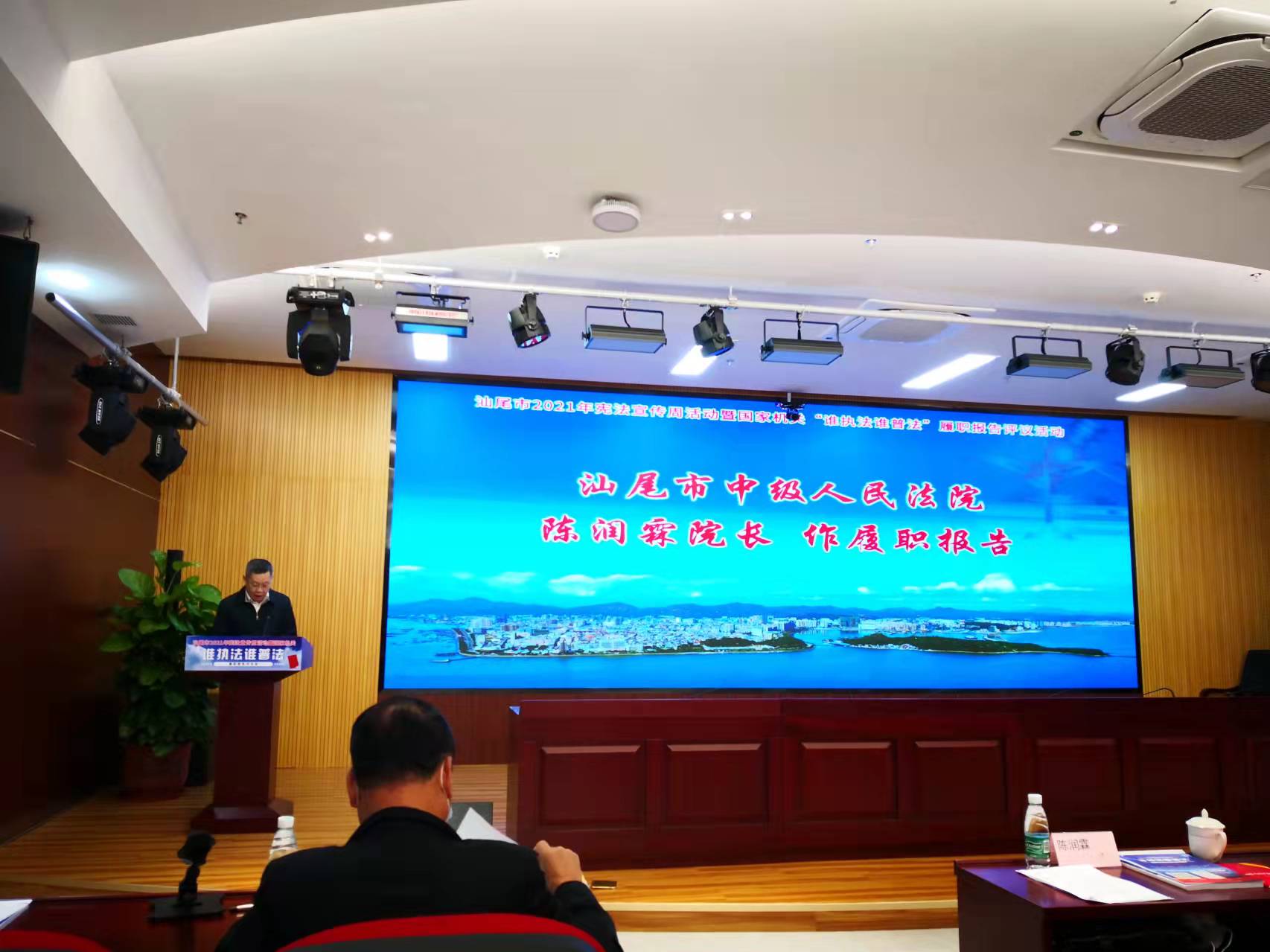 我院党组书记、院长陈润霖代表市中院作普法履职报告。经过社会评议、评议团实地考察、单位互评等环节,我院以总分97.43分的成绩位居参评单位第一,获评“优秀”等次。